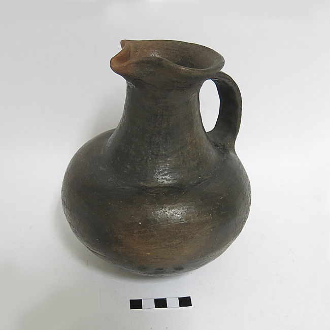 Recipiente de uso doméstico, de volumen restringido y un asa lateral; al extremo superior se eleva el cuello cilíndrico, estilizado con una abertura circular de borde divergente y en curva que forma el vertedor. El cuerpo es un volumen globular, abultado en la zona media. La base presenta un pie recortado en forma circular. Un extremo lateral lleva un asa curva y en forma de cinta.