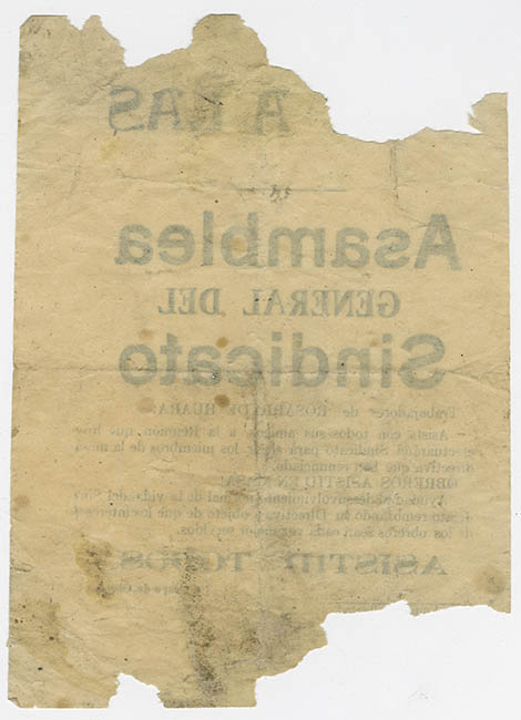 Documento de formato rectangular, dispuesto verticalmente. Corresponde a un impreso en tinta de color negro, con tipografía Sans Serif, sobre papel de color beige, con zonas más oscuras. Tiene irregularidades y faltantes en los bordes superior e inferior.