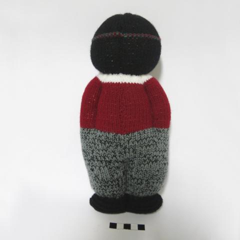 Objeto de uso recreativo, es un volumen cilíndrico, tejido, que representa un personaje masculino. al extremo superior presenta una cabeza abultada, de cabellera negra, corta y rostro esquemático de aspecto moreno; su cuerpo es abultado en la zona media, tiene las extremidades integradas al cuerpo, ésta cubierto por vestimenta de color rojo, pantalón gris y zapatos negros