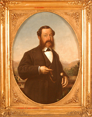 Obra de formato ovalado con marco dorado, cuya composición se basa en un retrato de figura masculina de medio cuerpo y medio perfil. El personaje, con cabello y grandes barbas castañas, viste chaqueta negra con camisa blanca. En su mano izquierda sostiene un bastón, y en su mano derecha sostiene un puro. En un segundo plano, se vislumbra un paisaje de un valle, con montañas y árboles, con cielo al atardecer.