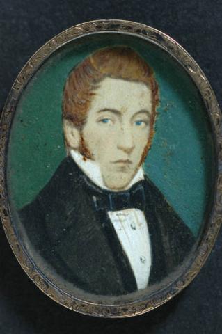 Obra de formato ovalado. Retrato de figura masculina de busto, tez blanca, pelo colorín y ojos azules . Viste pechera blanca y cuello extendido, corbatín, levita y chaqueta de color negro. Figura inscrita en fondo verdoso y marco ovalado.