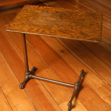 Mesa auxiliar, de madera y fierro; presenta una superficie rectangular, llana que se eleva sobre una estructura de metal compuesta por un soporte horizontal y un eje vertical, ubicado a un extremo lateral. En la base está formada por dos barras cilíndricas, metálicas terminada en cuatro breves patas de garra y bola.