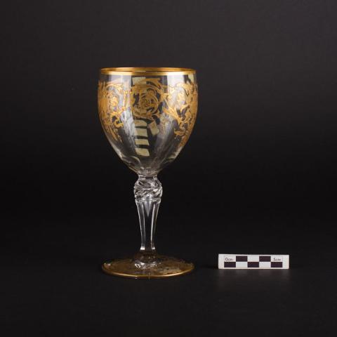 Objeto doméstico elaborado en vidrio transparente. Contenedor globular con decoraciones doradas en la superficie. Boca amplia de borde dorado. Pedestal cilíndrico de extremo superior abultado y cantos biselados. Base circular plana con decoraciones y borde dorado.