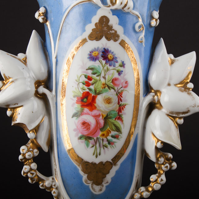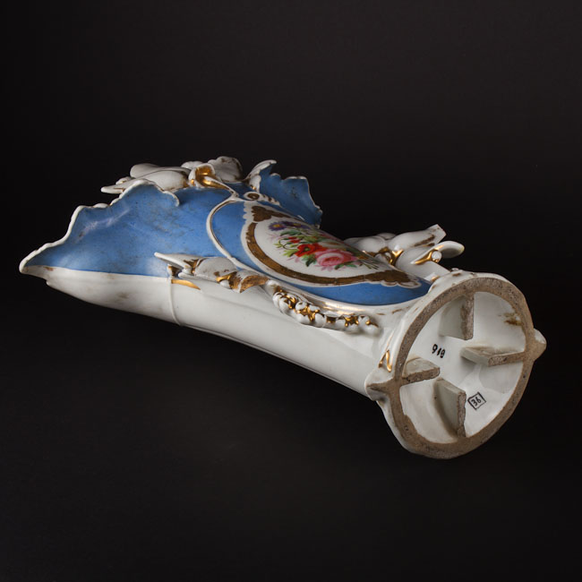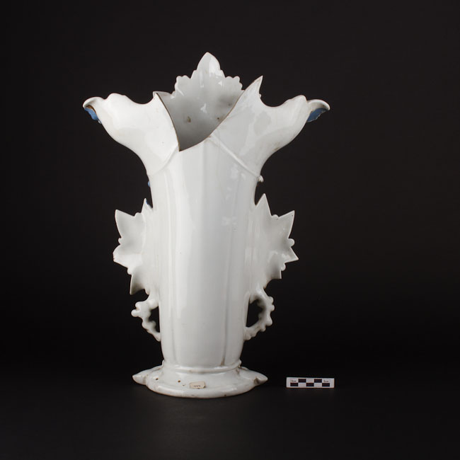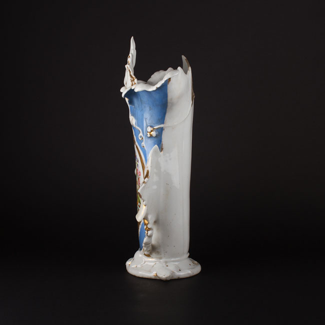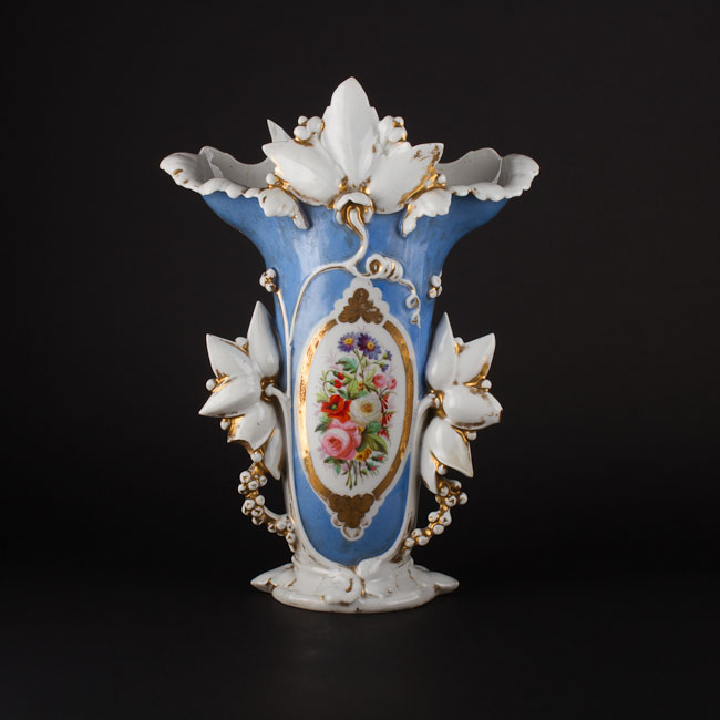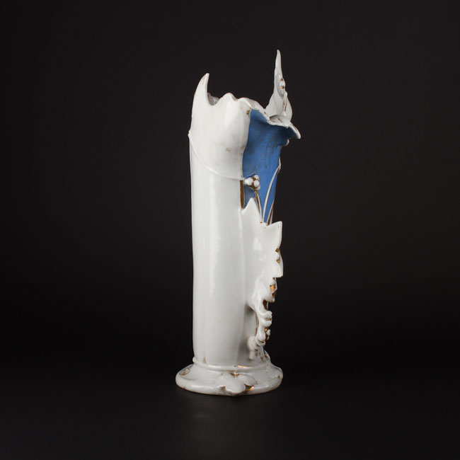 Objeto de uso decorativo. Recipiente blanco de cuerpo cilíndrico con boca campaniforme cuyo borde termina en acantos en sobrerrelieve. Una de las caras es azul, en cuyo sector central se oberva motivo fitomorfo encuadrado en franja dorada. Base circular decorada por hojas en sobrerrelieve. A modo de asas, en flores en sobrerelieve y guirnalda de esferas.