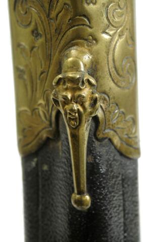 Arma blanca compuesta de una daga móvil sobre su eje y un revólver de 6 tiros, con sistema Lefaucheux, ubicado junto al guardamano; este es una lamina elíptica con los extremo en curva, que oculta el gatillo. La empuñadura es breve, levemente curva y al extremo lleva un pomo recto. Presenta decoración en relieve con diseño figurativo de hojas y roleos.