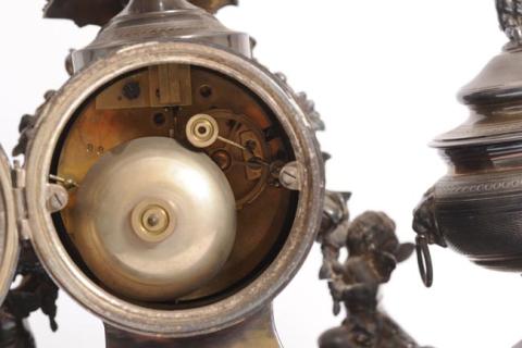 Objeto de uso personal elaborado en metal muy ornamentado. Lleva un reloj en el centro y sobre éste un adorno en forma de campana rematada por una figurilla. En ambos lados del reloj se ubican dos recipientes contenedores con tapa decorada, del mismo material.