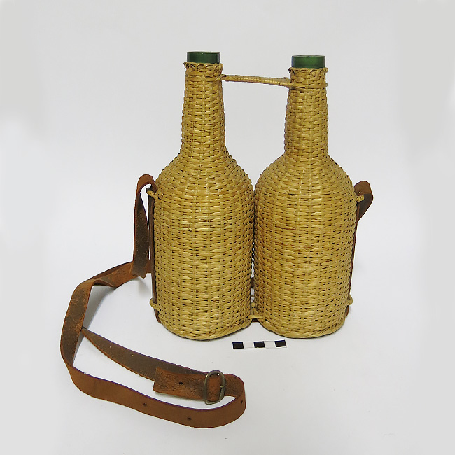 Objeto de utilitario, es un contenedor de agua compuesto por dos botellas de vidrio forradas por fibra vegetal tejida. A los costados tiene una cinta de cuero marrón.