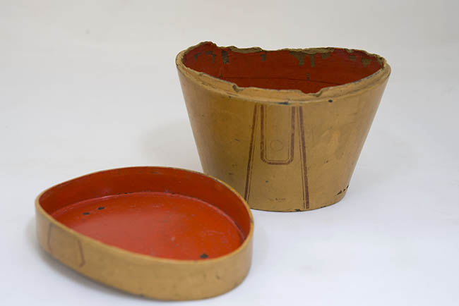 Estuche de papel pintado de color amarillo. Presenta una tapa en la que se ven tornillos de metal en la zona superior, aparentemente para sostener asa faltante. Presenta un dibujo en tono rojizo simulando un broche, en la cara frontal.
