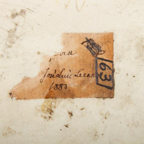 Objeto de uso decorativo. Recipiente cóncavo blanco liso decorado profusamente. Al centro, figura femenina recostada en una cama, cuya mano izquierda sostiene un crucifijo. La rodean tres personajes masculinos, uno de pie y de perfil, cuyas manos sostienen la mano de la mujer; otro de cuerpo entero y de pie que sostiene una bandeja; una tercera figura sedente con un cirio en la mano. En el sector superior, amplio cortinaje verde. Se rodea de decoración floral.
