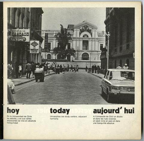 debajo se observan dos fotografías en blanco y negro. En su interior presenta una serie imágenes, fotografías en blanco y negro, de gran formato y junto al extremo tres breves bloques de texto en tres idiomas, español, inglés y francés.