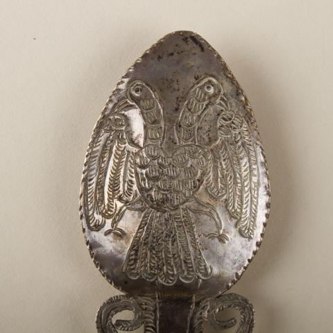 Objeto de uso personal. De forma alargada y de color gris. Uno de sus extremos es cóncavo y lleva dos figuras ornitomorfas labradas. Bajo este dos volutas decorativas desde la cual pende una cadena con una figura alargada y cóncava en su extremo. Tiene un extremo largo y curvo que se utiliza como pasador.