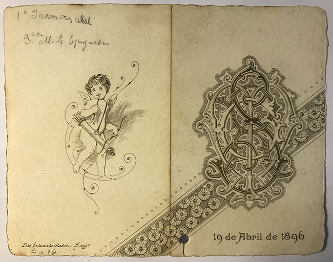 Documento rectangular en disposición vertical, impreso con tinta negra y dorada, en su portada y reverso, el cual presenta manuscrito de lápiz grafito. En su interior impreso de color dorado con manuscrito de lápiz grafito. En el costado superior izquierdo tiene un agujero.