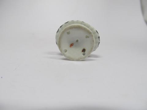 Pequeño busto de cabeza de hombre caracterizando a Pierrot, personaje circense con cuello de tipo lechuga y sombrero de tipo kipá blanco. La base posee 4 orificios y tiene en el reverso una inscripción ilegible con letras anaranjadas.