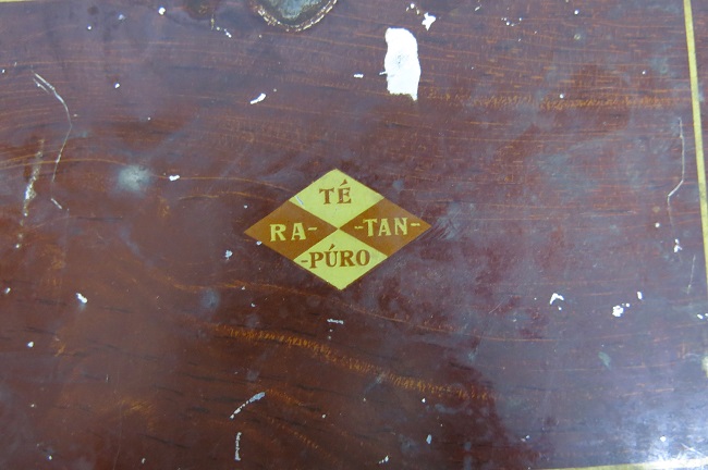 Contenedor rectangular metálico, de color café a imitación de madera de tipo cofre con bisagras metálicas. En la tapa aparece el logotipo de la marca, constituido por una figura romboidal donde se lee en la parte superior TÉ, a la izquierda RA- a la Derecha -TAN y en la parte inferior del rombo se lee -PÚRO. El mismo logotipo aparece representado en la parte frontal de la caja pero enmarcado en un rectángulo.
