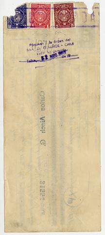 Papel impreso dispuesto de manera horizontal. En anverso presenta texto impreso en tinta azul y manuscrito en tintas azul y rojo. Presenta timbres y múltiples estampillas en el costado izquierdo del documento. En reverso timbres y estampillas.