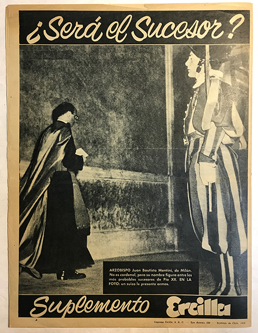 Papel impreso en disposición horizontal. En tapa texto en parte superior y costado derecho impreso en tinta blanca con fondo negro. En centro fotografia (Papa Pío XII) impresa en blanco y negro. En contratapa texto en parte superior e inferior en tinta blanca y fondo negro. Al centro fotografía en blanco y negro (cardenal y guardia suizo). En su interior textos impresos en tinta blanca y negra con diferentes informaciones (noticias, reportajes, crónicas, etc.). Incluye múltiples fotografias e ilustraciones impresas en blanco y negro.
