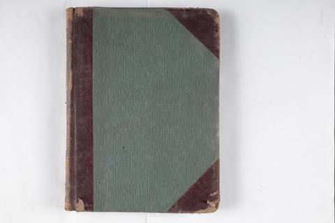 Objeto de forma rectangular en disposición vertical, de tapas duras color verde, con lomo y esquinas de cuero color marrón. Hojas color beige con diseño lineal horizontal y vertical azul y vertical rojo. Numeración en cada una de sus hojas en esquina superior derecha. 247 páginas.
