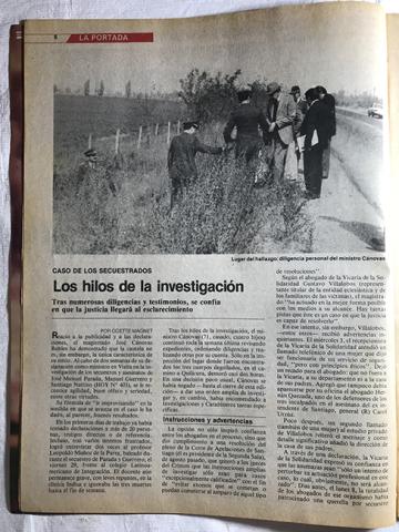 Objeto rectangular, en disposición vertical. Tapa y contratapa de papel couche. En anverso textos impresos en diferentes tamaños y colores (blanco, azul, rojo, amarillo, naranjo y negro), todo ello sobre fondo rojo con marco amarillo. En parte central titular en amarillo (Caso Secuestrados. Los hilos de la investigación). Bajo él fotografia en color (Ministro Cánovas). En reverso, sobre fondo blanco, publicidad de fotocopiadora con textos impresos en tinta roja y negra junto a fotogtafia en color de mujer. En interior, papel con diferentes textos (artículos, opiniones, reportajes, entrevistas, noticias, etc.) impresos en tinta negra. Se destaca " Desapariciones. Ausencia de pistas" Además, dibujos, fotografias, ilustraciones y caricaturas impresas en blanco y negro. (Se destacan los dibujantes Rufino, Hervi y Amengual). 52 páginas.