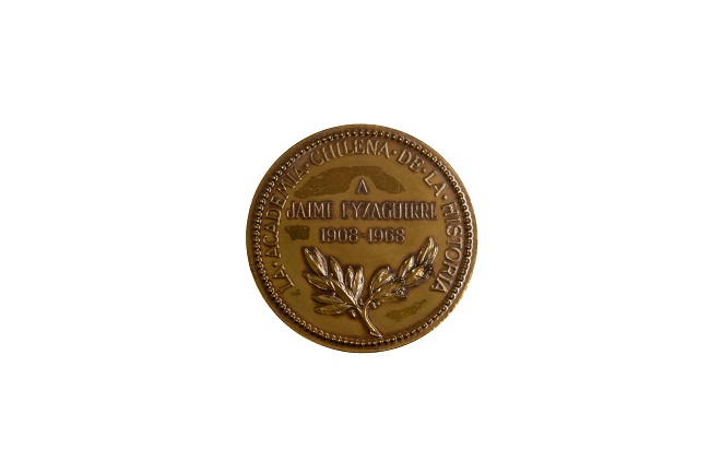 Pieza de bronce, de forma circular. El anverso presenta una figura masculina en sobre relieve de busto y perfil hacia la izquierda. En el reverso se lee “La Academia chilena de la Historia a Jaime Eyzaguirre 1908-1968”. Además posee una caja cuadrada de color café que en su interior tiene terciopelo azul.