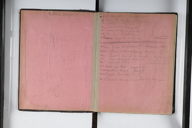 Objeto de forma rectangular en disposición vertical, de tapas duras color negro, lomos y esquinas de cuero marrones oscuras. Sus hojas son de color beige con diseño lineal vertical y horizontal con casillas. Numeración en cada una de sus hojas en esquina superior derecha. Aproximadamente 250 páginas.