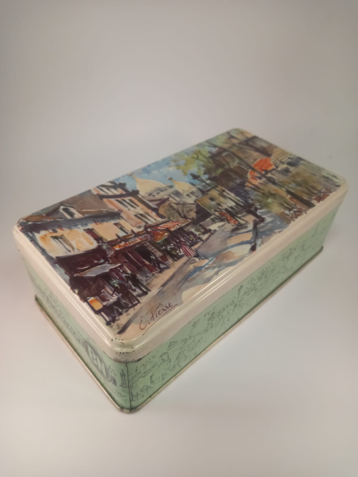 Contenedor de forma rectangular, con tapa y recipiente que juntos forman una caja metálica para galletas. En la tapa de la caja se representa una pintura de París con una calle, sus tiendas de comercio, edificios, faroles y gente paseando por la calle: detrás aparece la iglesia del Sacré Coeur, la escena está firmada por E. Pierre. Las paredes del contorno de la caja muestran distintos lugares turísticos de París, esbozados por líneas negras que dibujan la siluetas de todo lo representado sobre un fondo verde menta. Hacia cada costado se lee el logotipo de la empresa BN y el texto "Parisian Assorrment". En el reverso de la caja se encuentra una descripción en inglés, de los distintos tipos de galletas que venían en el envase, junto a las instrucciones para abrir la caja.