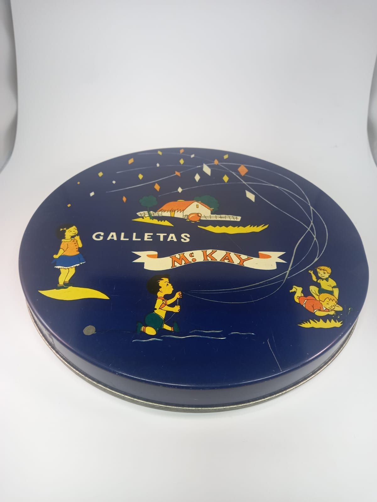 Contenedor de forma circular con tapa y recipiente que juntos forman una caja metálica para galletas. Tiene un fondo de color azul marino, en la cubierta se muestra una casa de campo con techo de paja, delante de ella hay dispuesta una tinaja, la casa cuenta con una reja y en frente hay un árbol y detrás de la casa otro árbol completa la escena. A la izquierda de la caja hay una niña de pie que viste blusa y falda y está girada hacia el centro de la composición. Al centro debajo de la casa está escrito la palabra "GALLETAS" y debajo se observa una cinta con el logotipo que contiene el nombre de la marca "Mc Kay". Debajo aparece u niño de perfil que está izando cuatro cordones de color plateado que serpentean hacia arriba entrecruzándose y mostrando 23 rombos de colores blanco, amarillo y anaranjado que representan volantines. Finalmente a la derecha y abajo de la imagen, aparecen otros dos niños jugando.