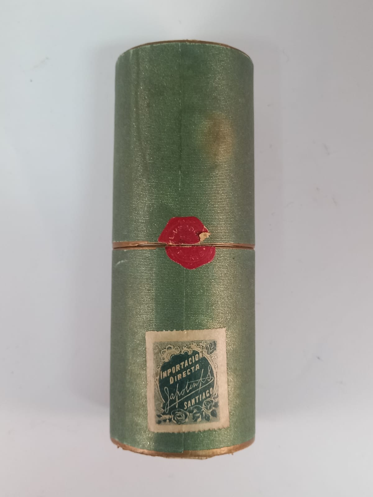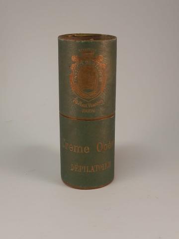 Contenedor usado para comercializar crema depilatoria. Tiene forma cilíndrica y se abre por el centro. Está elaborado en cartón rígido de color verde con letras doradas. En la parte central se encuentra el logotipo de la empresa, consistente en un escudo dorado con una corona en la parte alta, en cuyo interior aparece el rostro de una mujer de perfil. En el reverso hay un sello de calidad de lacre rojo y una estampilla.