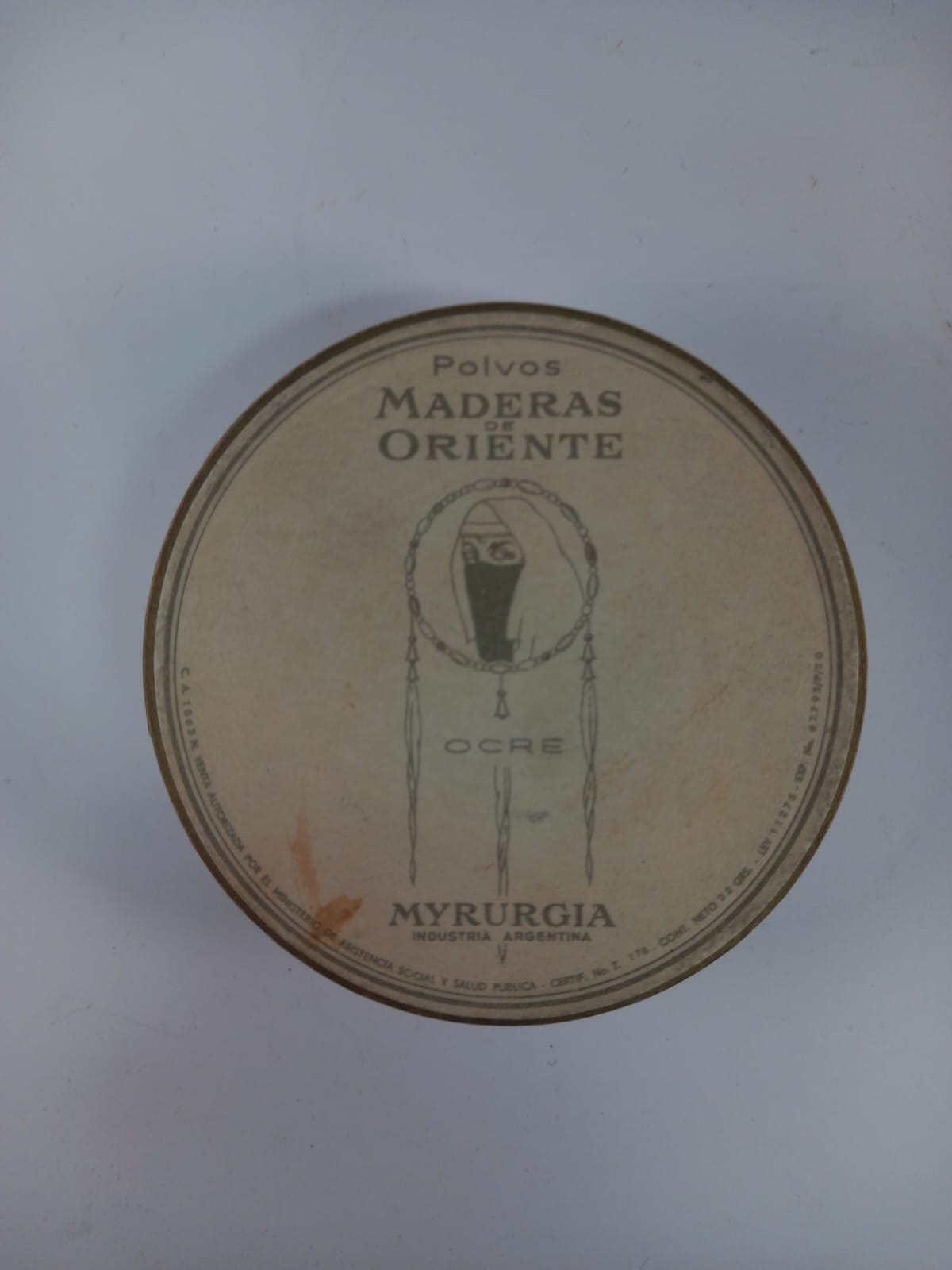 Contenedor y tapa que forman una caja circular para polvos de tocador. La tapa muestra la imagen de dos cúpulas de tipo oriental sobre un fondo azul, donde se aprecia la luna. En el reverso del recipiente está escrito: Polvos Madera de Oriente Ocre Myrurgia Industria Argentina.