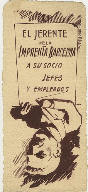 Objeto rectangular en disposición vertical. Cartón con Ilustración de hombre (Ignacio Balcells), y texto impresos en tinta negra en anverso. En reverso ilustración de trabajador de litografía impresa en tinta negra, además texto impreso en tinta negra.