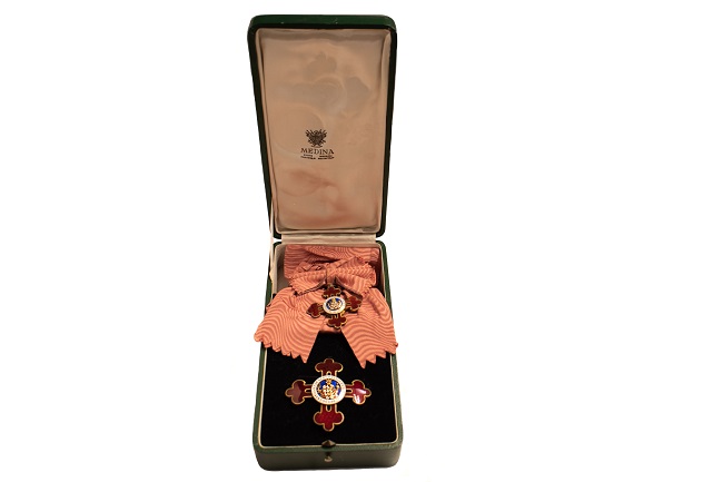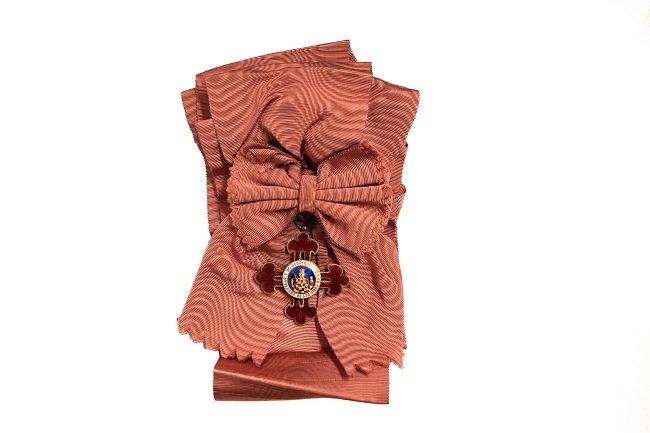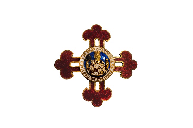 Objeto conmemorativo de metal y tela. Consta de una cruz abierta florenzada de esmalte carmesí, pendiente de un lazo doble, con caídas, color carmesí. La cruz lleva una medalla circular donde se representa una efigie de un monarca de medio cuerpo, con corona y vestido con un manto cuadriculado, donde figura en sus colores los emblemas heráldicos de León y Castilla. El busto en sobrerrelieve empuña con la mano derecha un cetro terminado con un águila explayada, mientras que con la izquierda sostiene un globo rematado con una cruz. En el reverso, una figura zoomorfa de color roja sobre una esfera negra. Posee, además, una placa con las mismas descripciones. Ambas piezas se encuentran en una caja de madera de color verde.