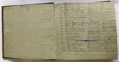 Objeto de tapas y lomo forrados en tela marrón, con timbre en tapa y lomo. Hojas de color beige con diseño lineal horizontal azul y vertical rojo. Numeración en cada página.