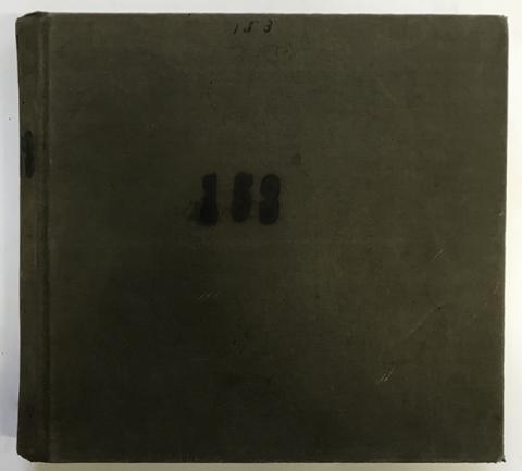 Objeto de tapas y lomo forrados en tela marrón, con timbre en tapa y lomo. Hojas de color beige con diseño lineal horizontal azul y vertical rojo. Numeración en cada página.