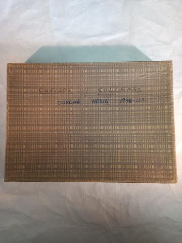 Caja de cartón de forma rectangular, forrada en papel con un entramado de líneas grises sobre un fondo de color crema, que forman un cuadriculado escocés. En el borde derecho de la tapa de la caja hay una etiqueta pegada con el siguiente texto: "Malla Microfilm Nylon sin costura 15 Denier 474 agujas; al centro aparece el dibujo de un escudo dispuesto en forma de pergamino con letras ilegibles en forma de monograma y a su derecha dice Color 3, Tamaño 8 1/2, Media docena.