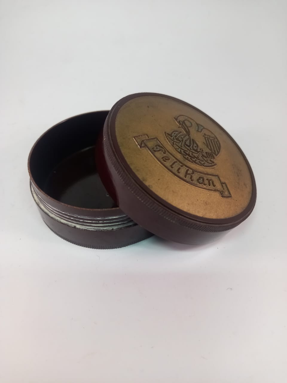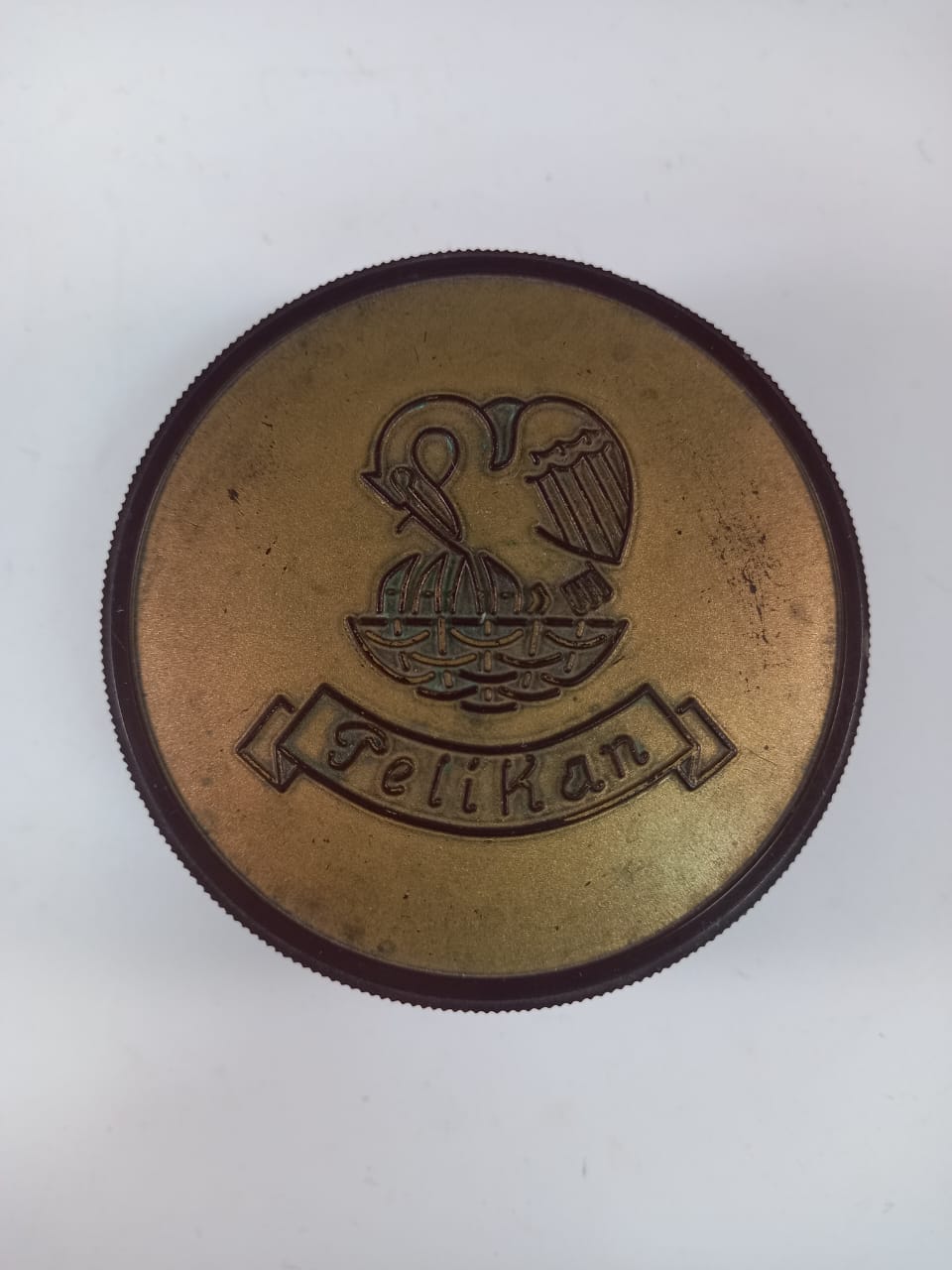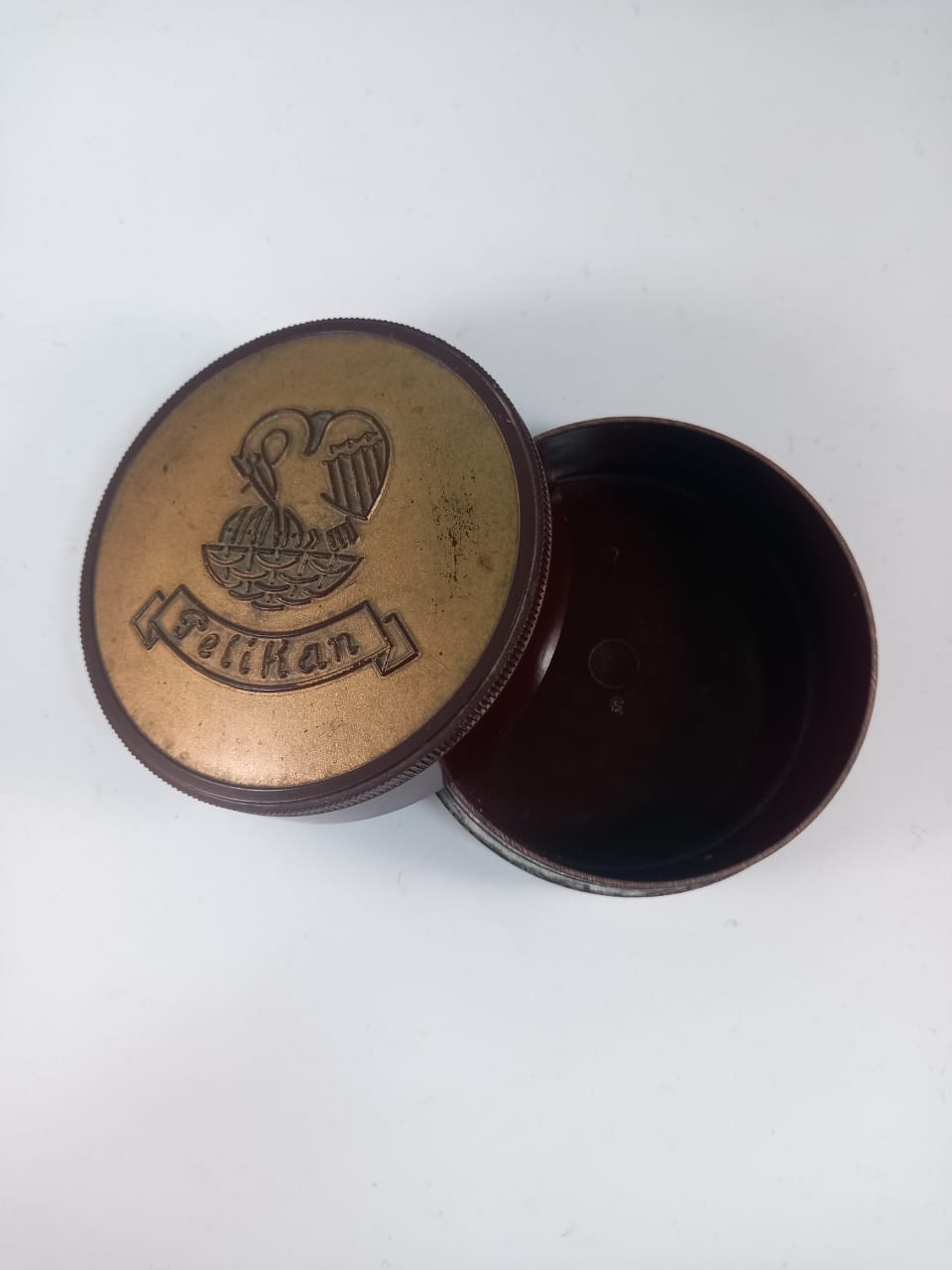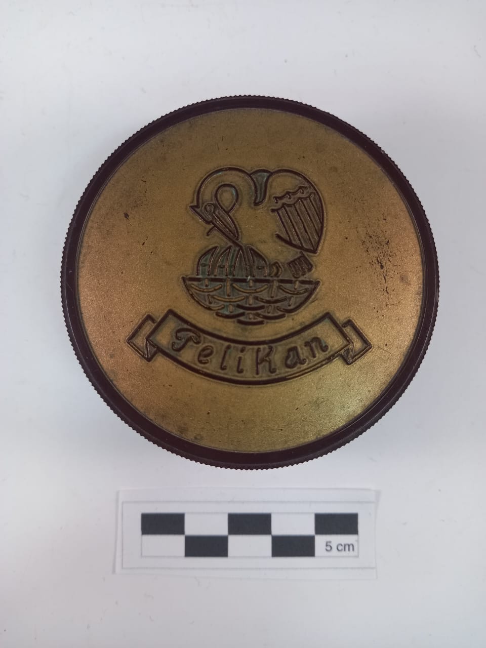 Contenedor circular, plástico de color marrón, con tapa de bordes marrón y cara superior dorada, con un logotipo y la inscripción Pelikan en la representación de una cinta.