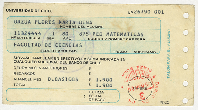 | Título: | Comprobante de pago aranceles de la Universidad de Chile. María Urzua Flores |