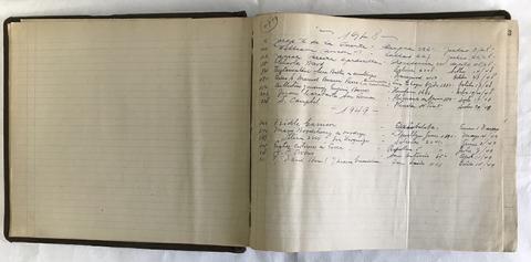 Objeto de tapas y lomo forrados en tela de color marrón. Hojas de color beige con diseño lineal rojo y azul. Numeración en cada hoja.