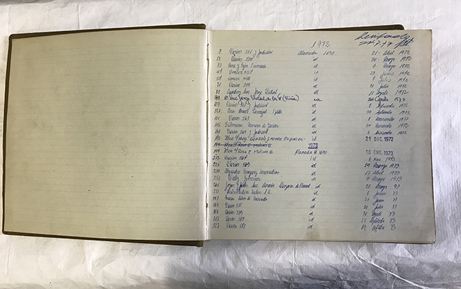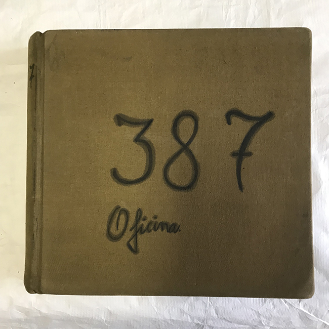 Objeto de tapas y lomo forrados en tela de color marrón. Hojas de color beige con diseño lineal rojo y azul. Numeración en cada página.