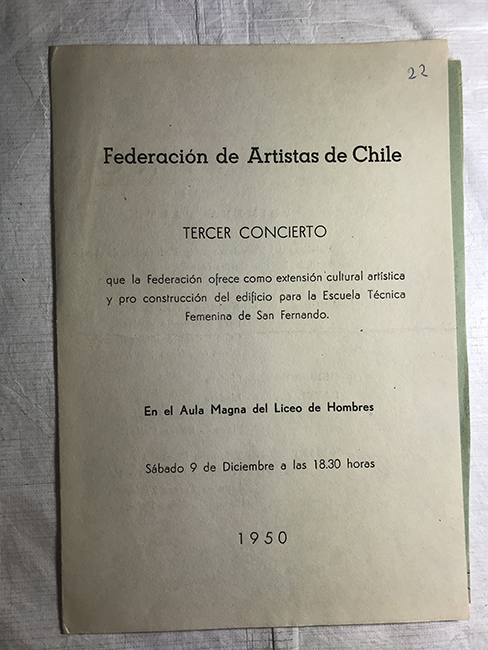 | Título: | Programa del tercer concierto de la Federación de Artistas de Chile. Pro construcción Edificiio Escuela Técnica San Fernando |
