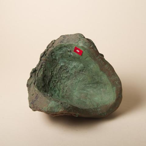 Molde de rostro masculino tomado directamente del modelo. Lleva cabello peinado hacia atrás, amplia frente, ojos cerrados, nariz prominente. De color verde y café, acabado envejecido.