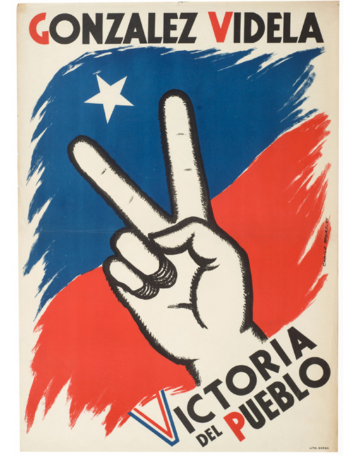 Obra visual de formato rectangular y disposición vertical, es una lamina impresa de colores azul y rojo, en letras negras se lee el nombre González Videla; al centro presenta la figura de una mano, con dedos índice y medio elevados y una estrella. En el extremo derecho se lee -Victoria/del Pueblo, dispuesto en forma diagonal.