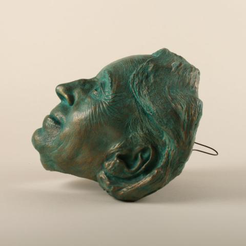 Objeto de uso conmemorativo. Rostro femenino moldeado sonriente y de cabello semi ondulado peinado hacia ambos costados. De color café y verde con un acabado envejecido.Molde tomado directamente del modelo.