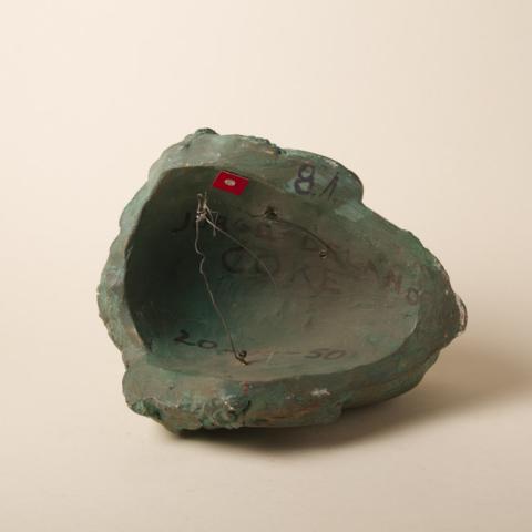 Objeto de uso conmemorativo. Rostro masculino, bigote recto sobre el labio superior y nariz ancha. Peinado hacia atrás. De color verde y café, acabado envejecido.