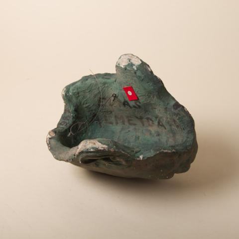 Objeto de uso decorativo. Rostro masculino imberbe de edad avanzada, con los ojos cerrados. Lineas de expresión marcadas, de color café y verde. Tiene acabado envejecido.