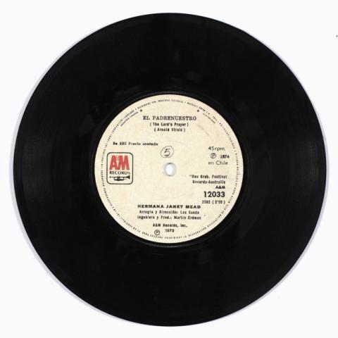 Objeto de difusión musical compuesto por un disco de vinilo y su carátula. El disco de vinilo es de color negro con surcos en circunferencia. En su parte central tiene una etiqueta circular de color blanca con tipografía de color roja y negra, y un agujero circular. Su carátula es un contenedor de papel de color verde con impresiones en blanco, en la esquina inferior derecha tiene un pequeño imagotipo edificio de columnas con un cúpula en la parte superior. En su parte superior tiene un adhesivo manuscrito con un número. Y presenta un manuscrito con lápiz grafito.