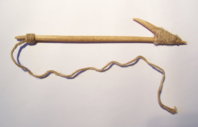 Instrumento usado en faenas de pesca. Objeto compuesto por un mango cilíndrico con ambos extremos apuntados, y un vástago aguzado unido a la punta. Se encuentra embarrilado por un cordel de fibra vegetal de color marrón claro que une las dos piezas y que actúa como sedal en el extremo proximal. Hueso pulido de color marrón claro.