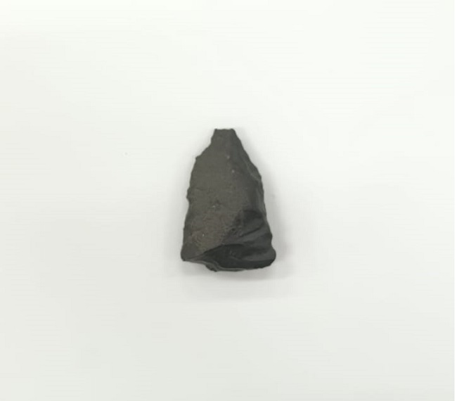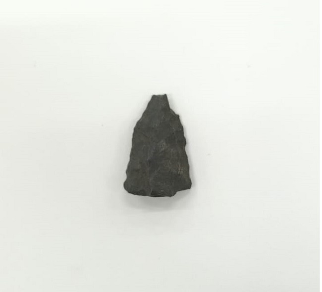 Pieza lítica gris oscura de forma triangular, con extremo distal apuntado y base ancha de contorno irregular. Una cara de relieve facetado con cicatrices de lascado visibles y la otra más lisa y homogénea. Trabajo de tallado en los bordes lateral.