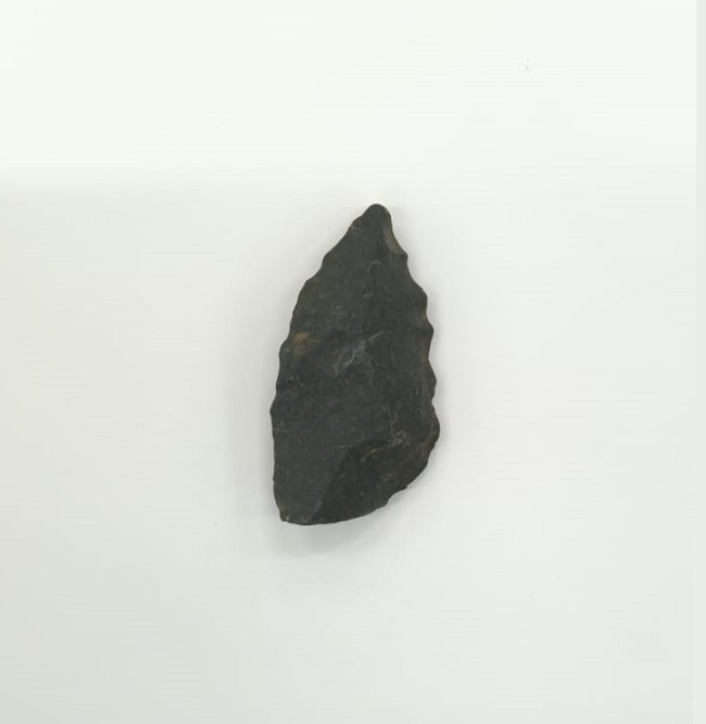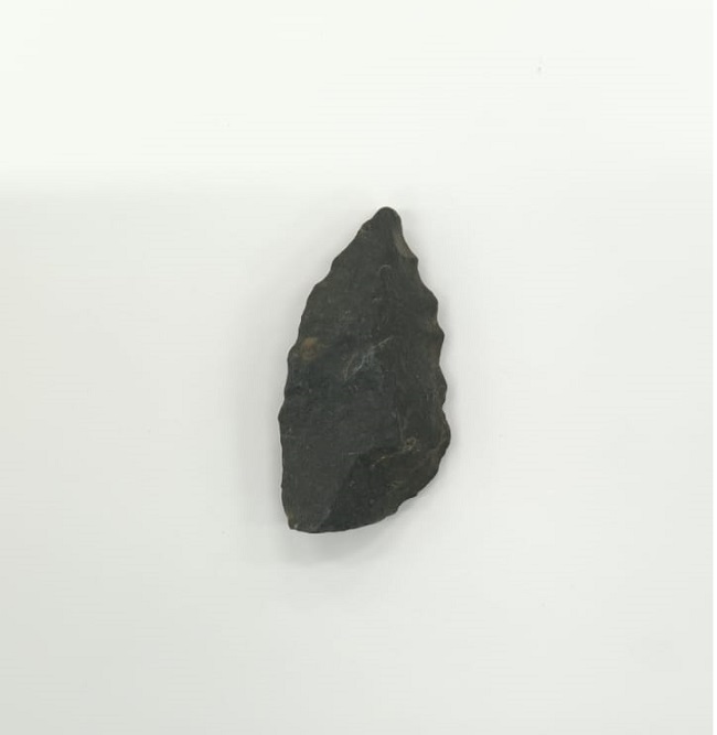 Pieza lítica negra de forma foliácea asimétrica, con extremo distal apuntado y base estrecha. Ambas caras presentan relieve facetado con cicatrices de lascado visibles. Trabajo de tallado en los bordes laterales, con filos dentados.