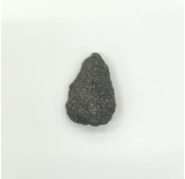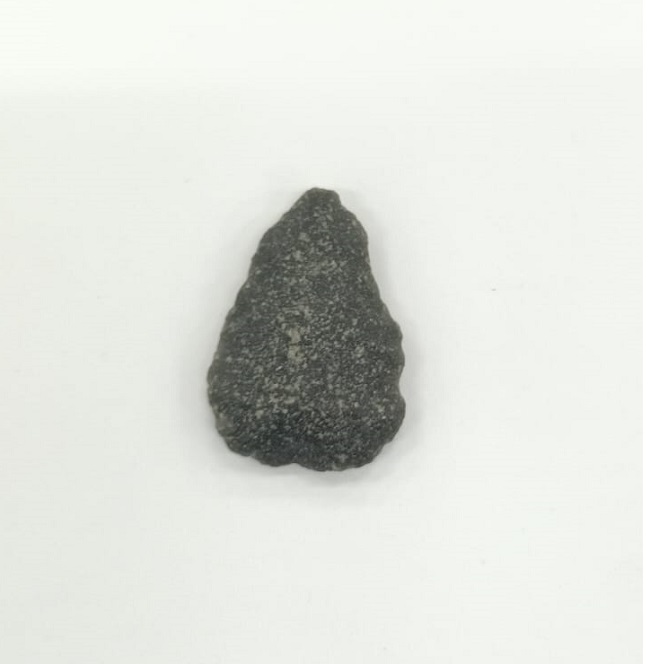 Pieza lítica gris oscura de forma ovalada a lacrimiforme, con extremo distal apuntado redondeado y base ancha curva. Ambas caras de superficie granulada y textura rugosa, con motas claras visibles en la matriz. Trabajo de tallado marginal en los bordes, con filos ondulados.
