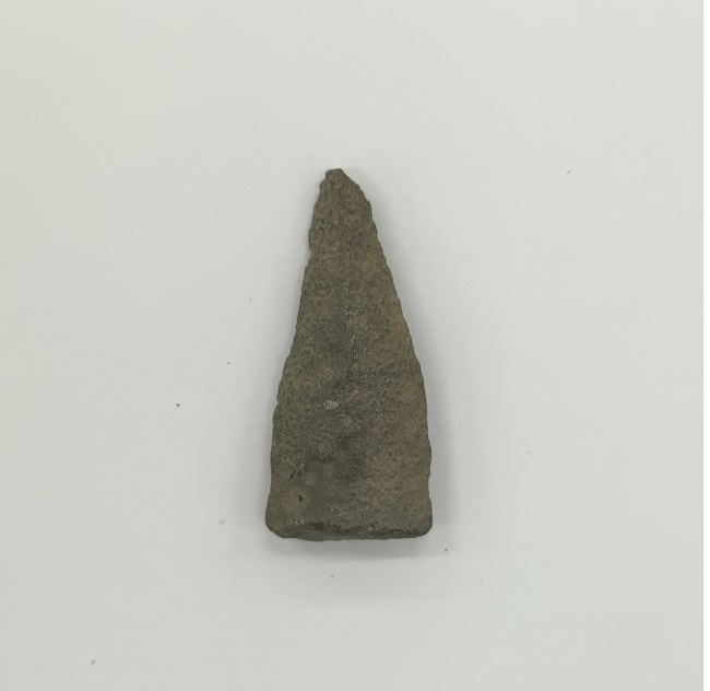 Pieza lítica gris parduzca de forma triangular alargada, con extremo distal apuntado y base recta ancha. Ambas caras de superficie relativamente plana y textura granulada homogénea. Trabajo de tallado marginal en los bordes laterales.