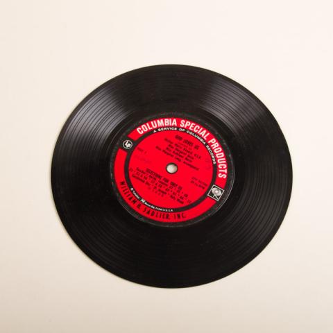 Objeto de difusión musical compuesto por un disco de vinilo y su carátula. El disco de vinilo de color negro con surcos en circunferencia. Al centro tiene un orificio y una etiqueta de papel circular de color rojo impresa con tipografías de color negro y blanco. En el centro tiene un pequeño orificio. En la misma etiqueta presenta manuscrito con lápiz grafito. Tiene un sobre carátula de color café con un orificio en su parte central y a la derecha e izquierda presenta manuscritos.